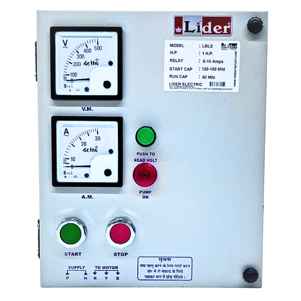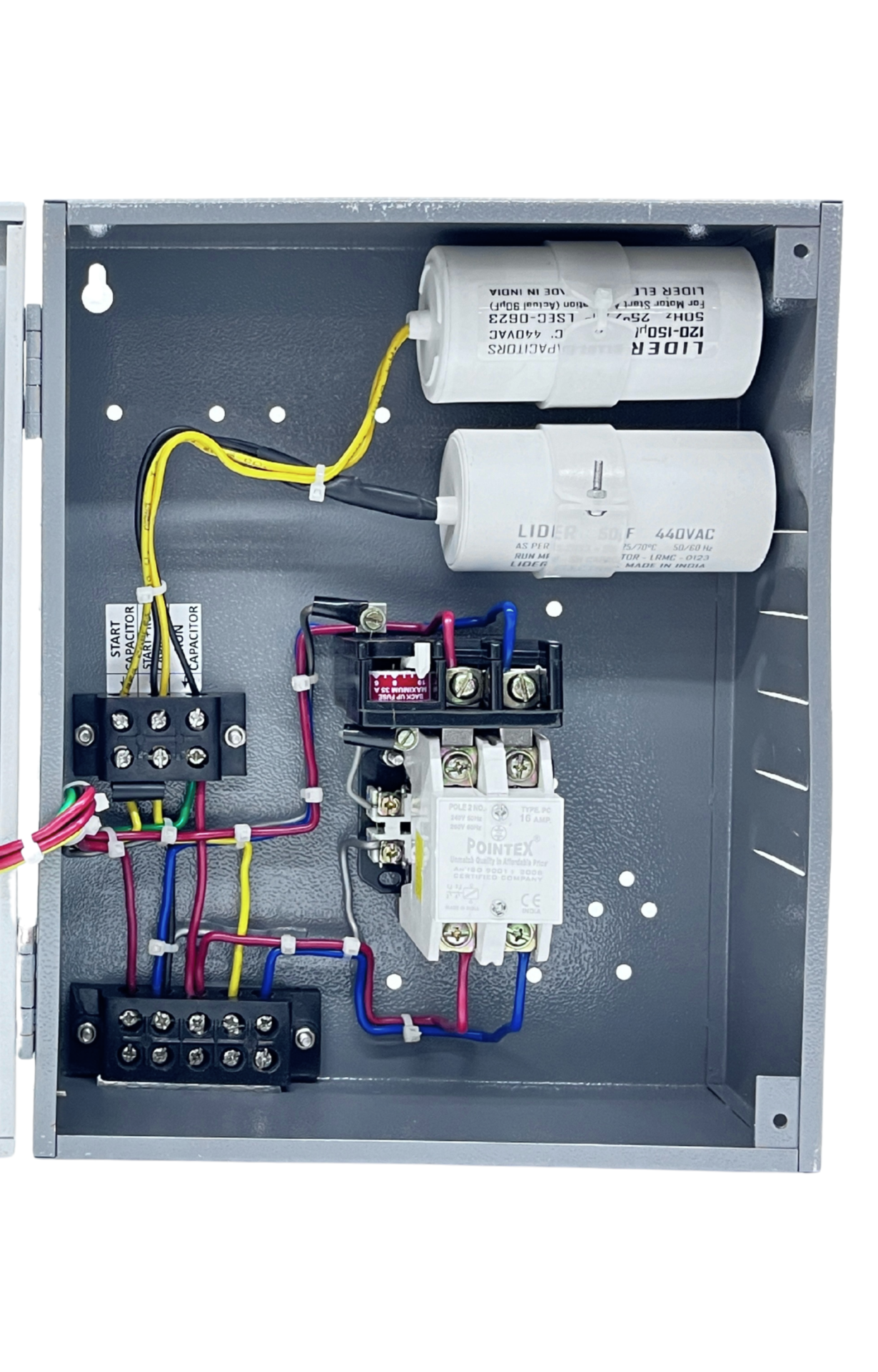 LIDER 1 HP Control Panel for single-phase Motor Pump provided with 16 Amps BCH type Contactor with easy replaceable heavy-duty fixed and moving contacts and Coil Voltage range between 160-240 Volts with easy replacement of coil.