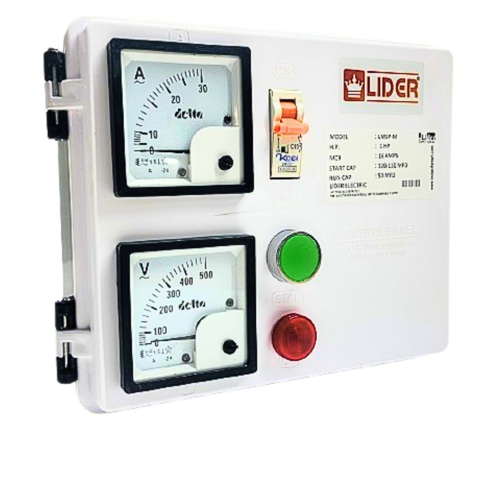 Switching device provided-Single Pole Miniature Circuit Breaker [MCB-C Series-Inductive Load] of capacity 10 Amps which ensures protection against short circuit.Start Capacitors of rating 120-150 Mfd provided for giving initial torque to the motor of 1 HP connected to Start Button which charges and discharges the start capacitor.