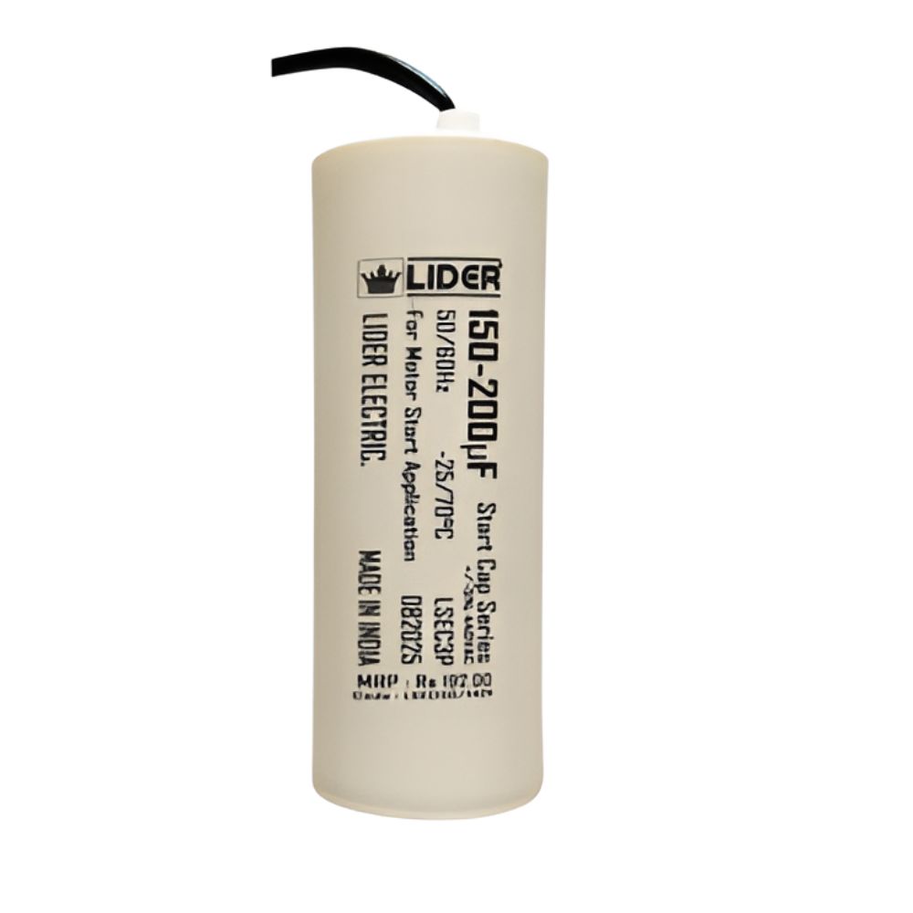 A start capacitor with a rating of [150-200 MFD] microfarads (MFD or µF) is a high-capacity, non-polarized electrolytic capacitor designed to provide a momentary power boost to single-phase AC motors, particularly those found in water pumps, submersible pumps, and HVAC compressors. Its primary function is to generate the high initial torque needed to start the motor under load.